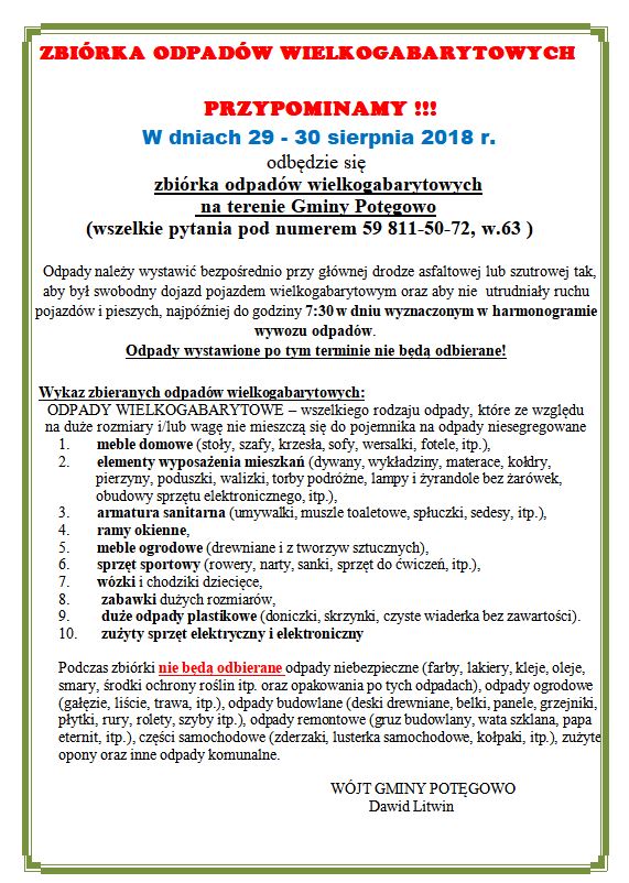 Wójt Gminy Potęgowo informuje, iż w dniu 14 stycznia 2019r. do tutejszego urzędu wpłynęła oferta w trybie art. 19a ustawy z dnia 24 kwietnia 2003r. o działalności pożytku publicznego i o wolontariacie (tekst jednolity Dz. U. z 2018 r. poz. 450)  na wykonanie zadania z zakresu kultury fizycznej pn: ,,Organizacja Międzyszkolnej  Ligi Tenisa Stołowego"