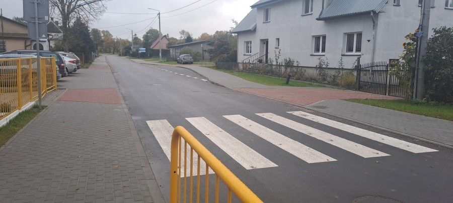 - oznakowanie poziome i pionowe tj. przejście dla pieszych, zamontowano znak aktywny zasilany panelem solarnym, radarowy wyświetlacz prędkości zasilany panelem solarnym, słupki blokujące U-12c;