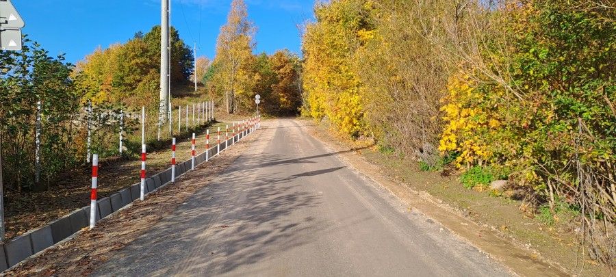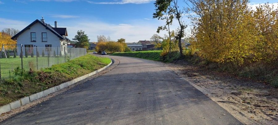 - przebudowa drogi o łącznej długości 956mb o nawierzchni asfaltowej o szerokości zmiennej od 5m do 3,5m wraz z dwoma mijankami o szerokości 5m;