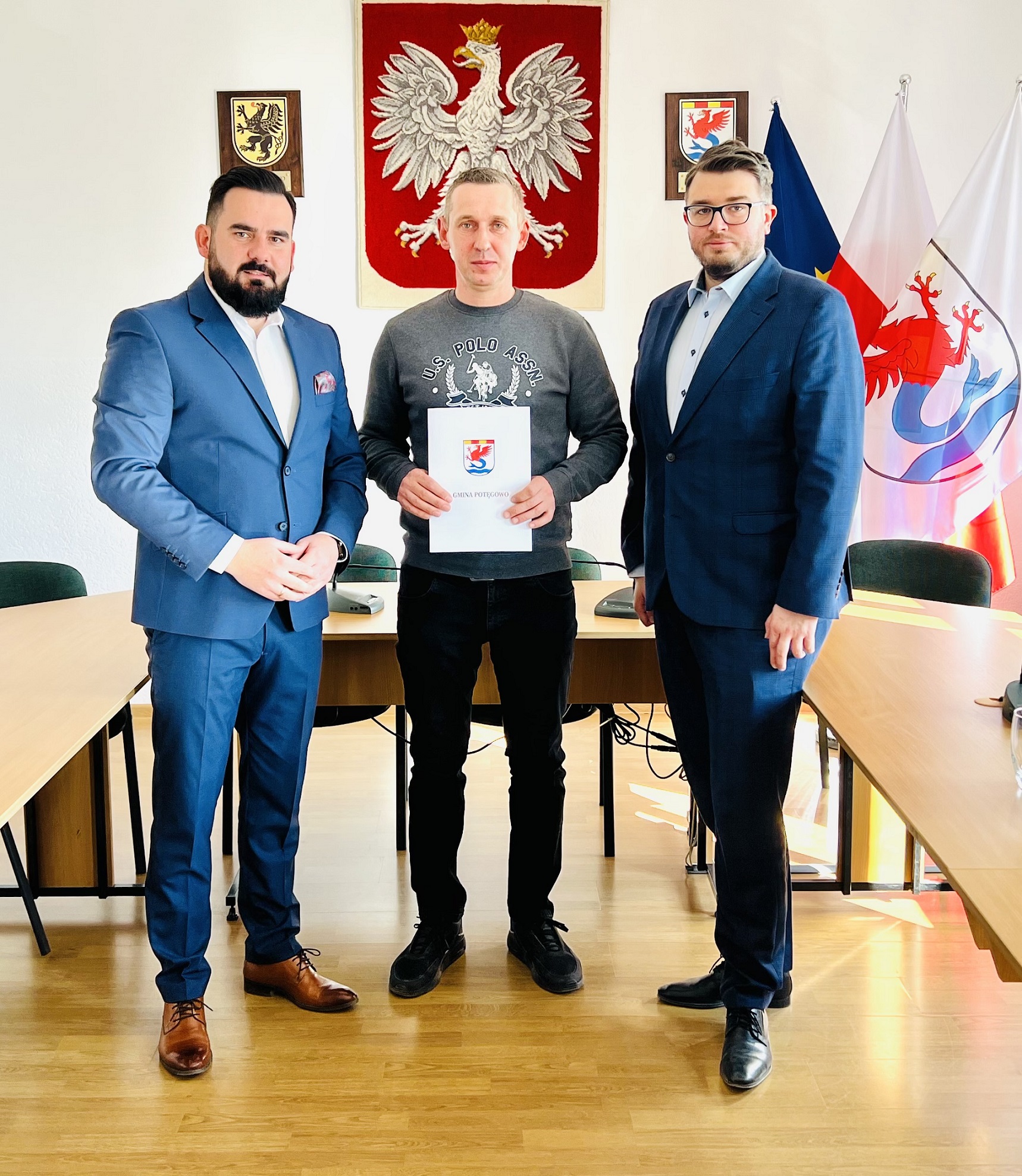 od lewej: Wójt Gminy Dawid Litwin, przedstawiciel BGK Michał Maliński, Wykonawca Artur Chadacz; w tle godło, herb, flagi